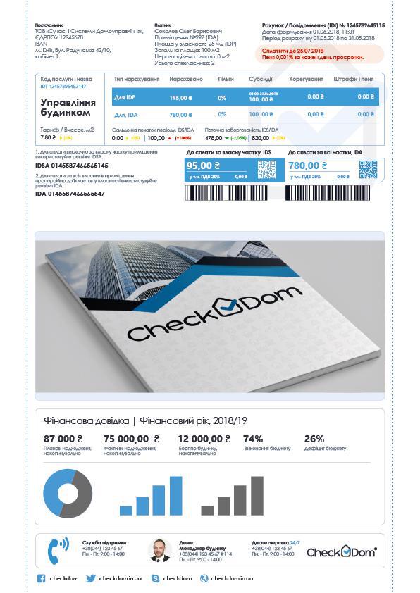 CheckDom формує рахунки (повідомлення) для оплати платежів за управління багатоквартирним будинком та інших, визначенних рішенням загальних зборів, внесків у встановленному форматі.