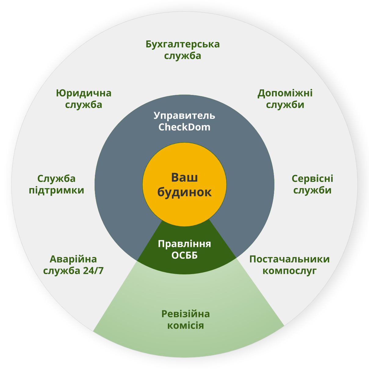 CheckDom приймає на себе функції з управління, залишаючи Правлінню функцію контролю за діяльністю, затвердження звітів та прийняття ключових рішень в межах компетенцій. Після підписання договору, СheckDom синхронізує діяльність ОСББ зі своїми операційними процесами та виконує свою роботу згідно договору.